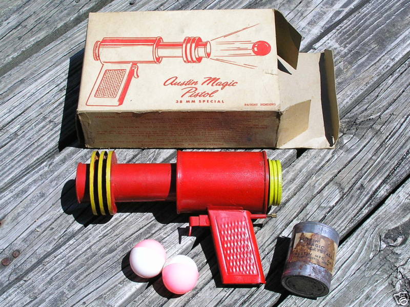 A “Pistola Mágica de Austin”, lançada nos anos 50, contava com produtos químicos (Carbonato de cálcio) que, se combinado com água ou saliva, ocasionava uma explosão, lançando uma bolinha que era colocada no seu cano.