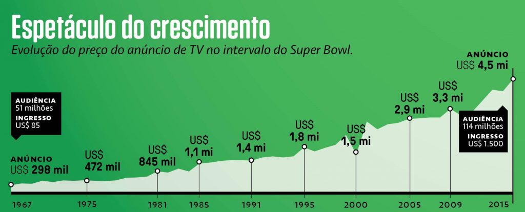 O evento acontece no primeiro domingo de fevereiro, religiosamente e, seu público no mundo todo pode alcançar a gigantesca marca de 1 bilhão de telespectadores. Por isso, para alguém aparecer na final da NFL é tão caro.